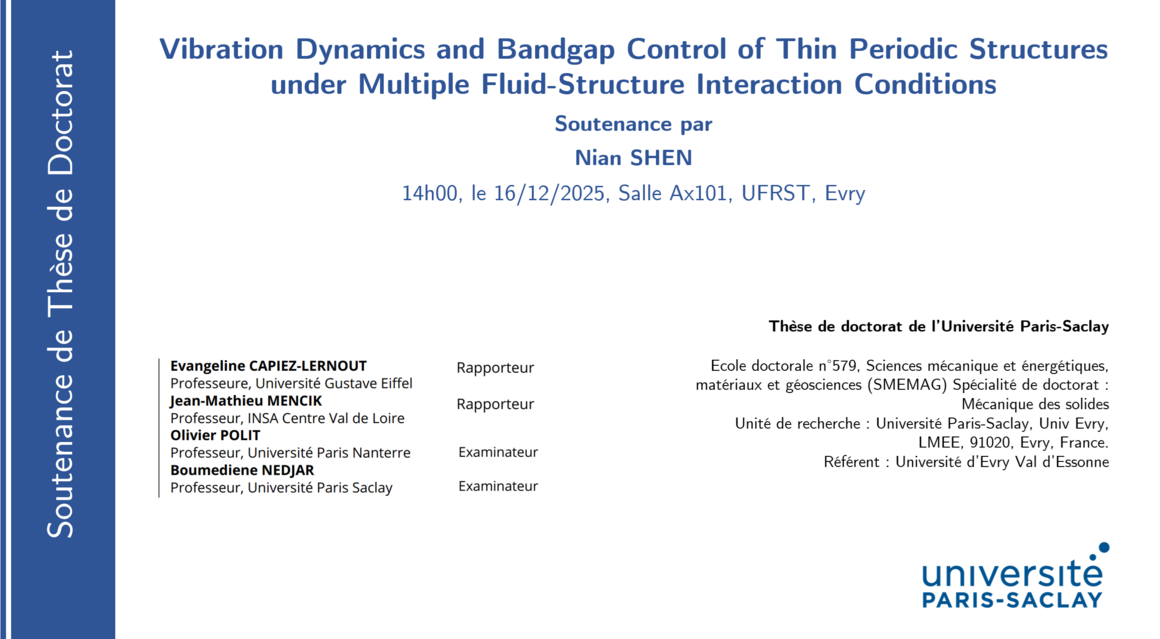Nous annonçons la soutenance de thèse de Nian SHEN, dont les travaux portent sur “Dynamique vibratoire et contrôle des bandes de fréquence de structures minces périodiques sous différentes conditions d’interaction fluide–structure”. La soutenance aura lieu le mardi 16 décembre 2025 à 14h à la Salle Ax101, UFRST, Evry. Cette thèse a été réalisée au LMEE sous la direction de Zhi-Qiang Feng et co-encadrée par Yu Cong.